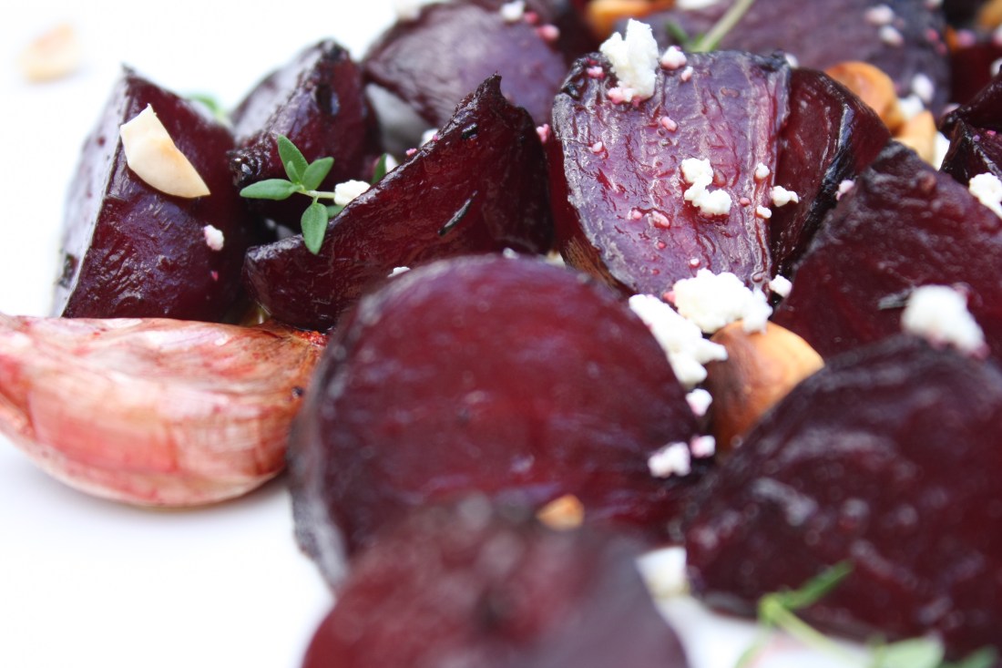 Preheat oven to 180 C. Peel the beetroot, trying to take only the thinnest amount of the skin off, as all the best nutrients are close to the skin. You’ll get very pink fingers, so you might want to wear gloves to avoid curious glances for the rest of the day. Cut the beetroot into small wedges and place in a glass bowl. Add the olive oil, about 10 – 12 springs of thyme, the two garlic cloves (no need to peel them, as their flavour will permeate the beetroot) and season well with salt and pepper. Mix well with a large spoon to coat the beetroot evenly. Tip into a roasting pan, cover with aluminium foil, and roast for 1 1/2 hours. Check after an hour and give the beets a toss to make sure they are not sticking to the pan. When the beetroot is done, carefully pick out the thyme stalks and then place the beetroot on a serving platter. Sprinkle over the toasted hazelnuts, cheese and then scatter with a few more sprigs of fresh thyme. Serve hot or at room temperature.