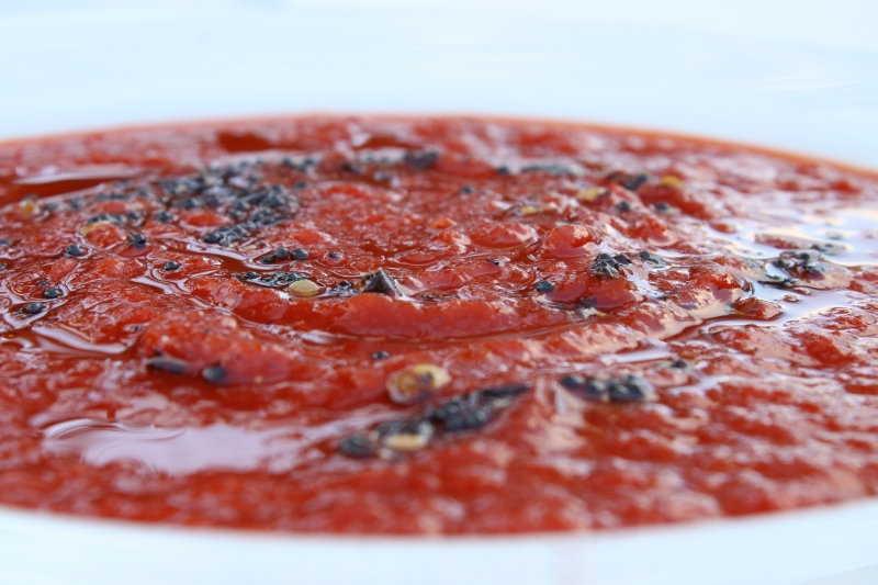Preheat oven to 180 C. Put the capsicums on an oven tray and roast for about 40 minutes until the skins are beginning to blacken. Take them out of the oven and as soon as they are cool enough to touch without burning your fingers peel off the skins. They should slip off very easily. Carefully remove the seeds and then chop up the capsicums and place in a medium saucepan. Add the tomatoes, finely chopped garlic and the vegetable stock and break up the tomatoes with a spoon. Simmer for about 15 minutes and then, using a stick blender, or in a food processer, whizz until fairly smooth. Season with a little sea salt and serve with the spiced oil on the side for everyone to add according to their taste..