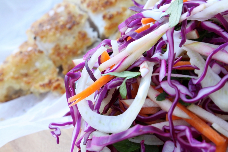 This recipe is my take on American southern fried chicken, where chicken pieces, usually on the bone, are marinated in buttermilk, coated with crumbs and deep fried. I’ve gone for a much lighter approach by pan frying in a little oil and butter, but used the buttermilk, along with whole-grain mustard, to marinate chicken breasts, and Japanese panko breadcrumbs as my coating. The result is almost unbelievably tender chicken, and the subtle aniseed-like fennel and sweet apple in the slaw are a food marriage made in heaven. I’ve come slowly towards fennel, as in my childhood, aniseed was a studiously avoided flavour. I was the child who peeled off the layers of licorice in licorice all-sorts and left them for my father to eat, while gobbling up the sweet candy layers. Ouzo is still a bridge too far, but a baby fennel bulb, sliced very thinly, is now a taste I adore. The dressing on the slaw is also very light and uses buttermilk and Greek yoghurt rather than mayonnaise, so no guilt is necessary. If you are making ahead, don’t add the dressing until just before serving. The purple cabbage will share its colour with the dressing and turn it a pinky-purple. Pretty, but it’s nice to see all the bright colours of the carrot and parsley as well as the deep purple cabbage. This makes a great meal for a Friday night dinner and movie.