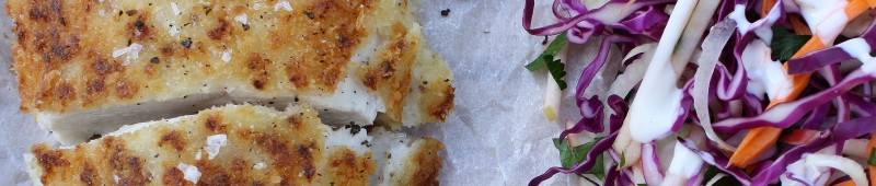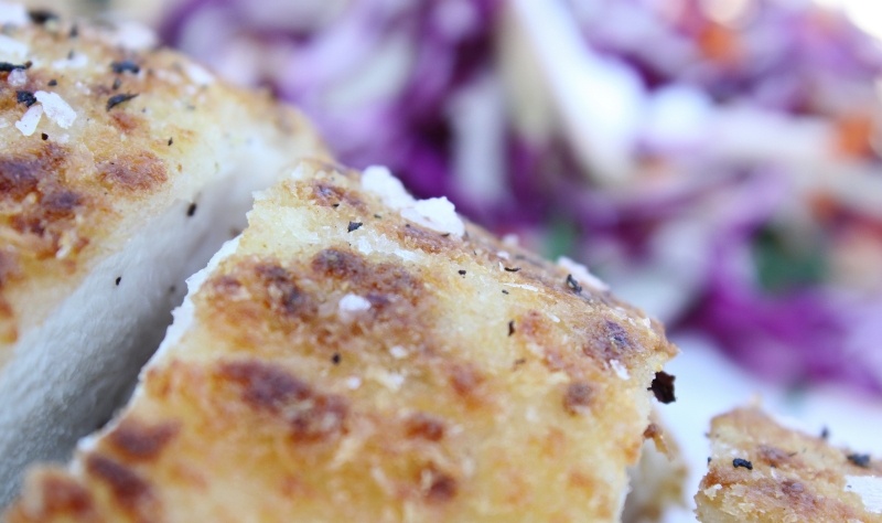 Place the chicken breasts in a glass dish with the buttermilk and mustard and stir to coat well. Cover and leave in the fridge for about 30 minutes to marinate. Put the breadcrumbs onto a plate and then lift the chicken out of the marinade and coat well with the crumbs. It’s good if you can do this a little ahead of time and put the chicken back into the fridge for about 20 minutes. Heat the oil and butter in a shallow, non-stick frying pan until sizzling. Cook the chicken over a medium heat for 6 – 8 minutes each side, or until the coating is crispy and golden and the chicken cooked through. The cooking time does depend a little on how thick the thickest part of the chicken is. Season with salt and pepper then slice the chicken horizontally into 4 or 5 pieces and serve with the slaw.