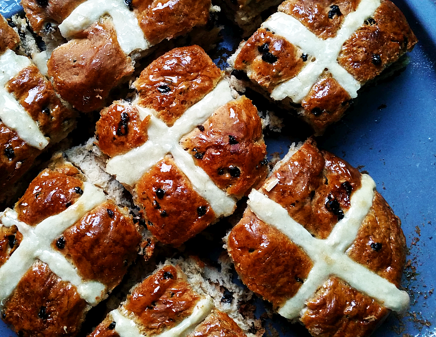 Combine flour, yeast, sugar, mixed spice, salt and currants in a large mixing bowl. Melt the butter in a small saucepan over medium heat. Add the milk and heat for a little longer, until the mixture is lukewarm. It needs to be not too hot and not too cold to activate the yeast. Add warm milk mixture and eggs to the dry ingredients. Use a knife to mix until dough almost comes together. Then finish mixing to form a soft dough with your hands.